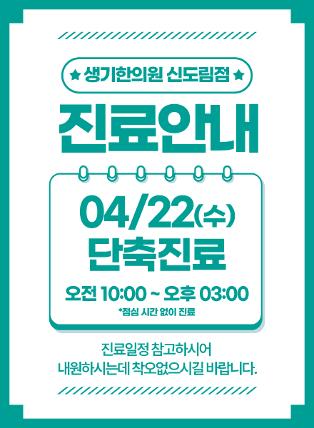 화, 금 야간진료 / 목요일 전체 휴진 / 점심시간 : 오후 1시부터 ~ 오후 2시 30분까지 (토요일 점심시간 없음)