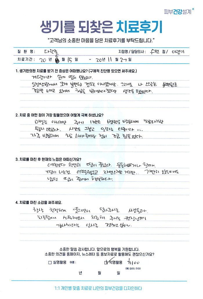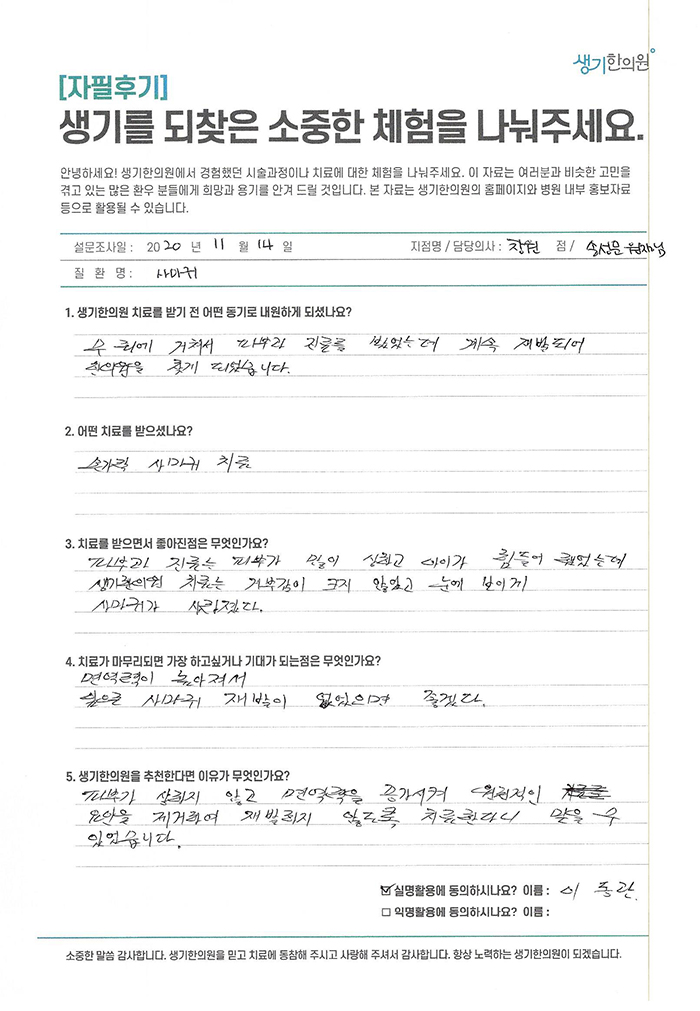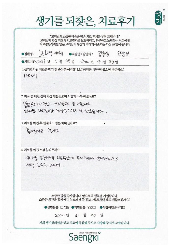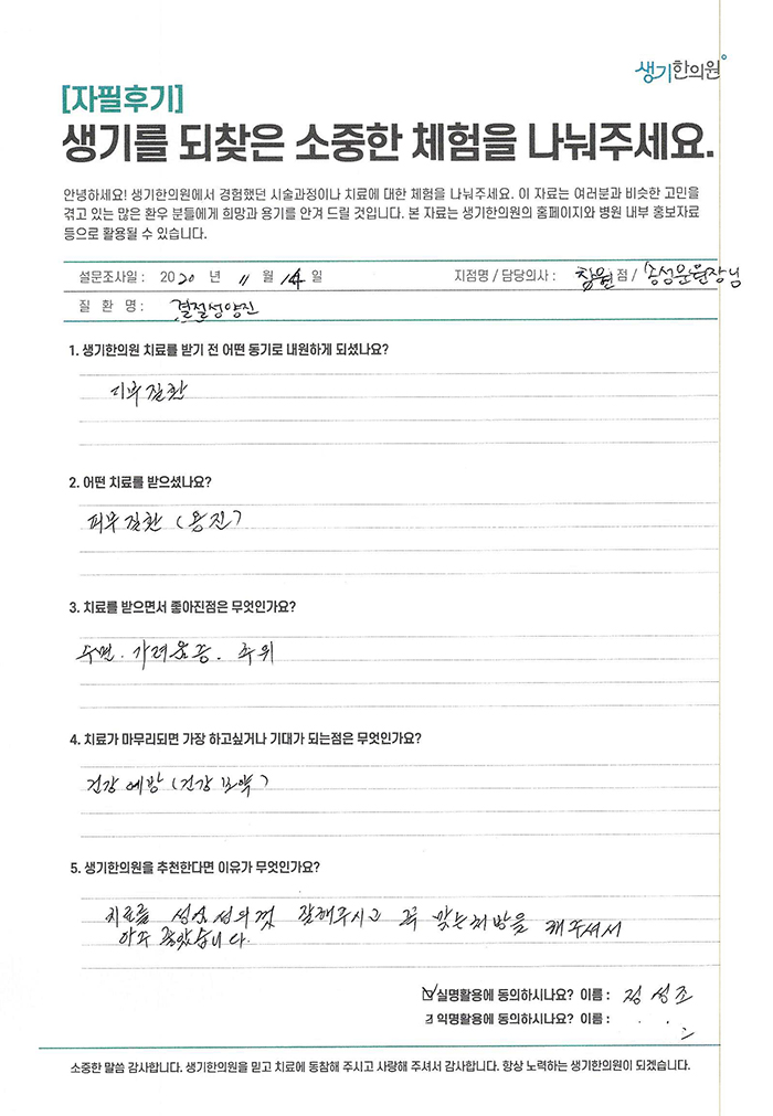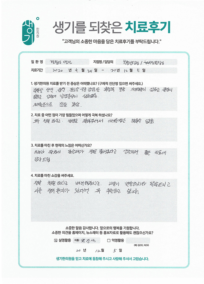 생기한의원과 함께하신 생생한 자필 및 영상 후기를 소개합니다.
