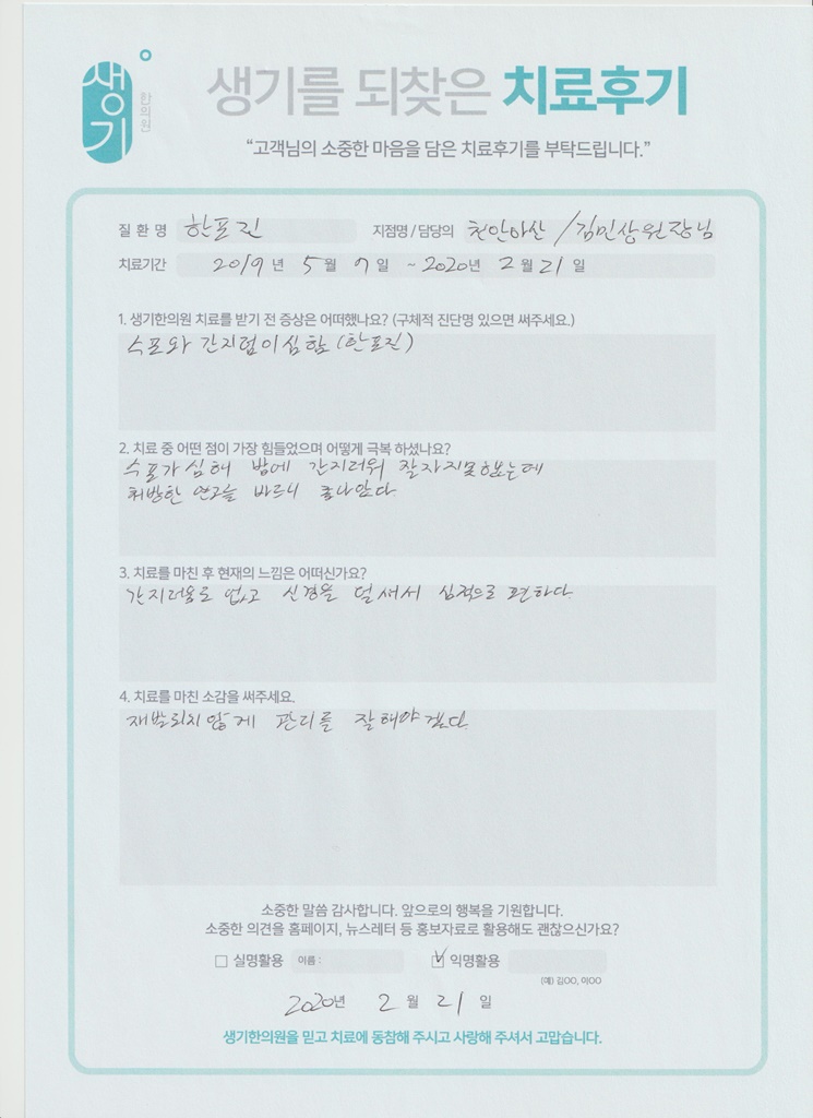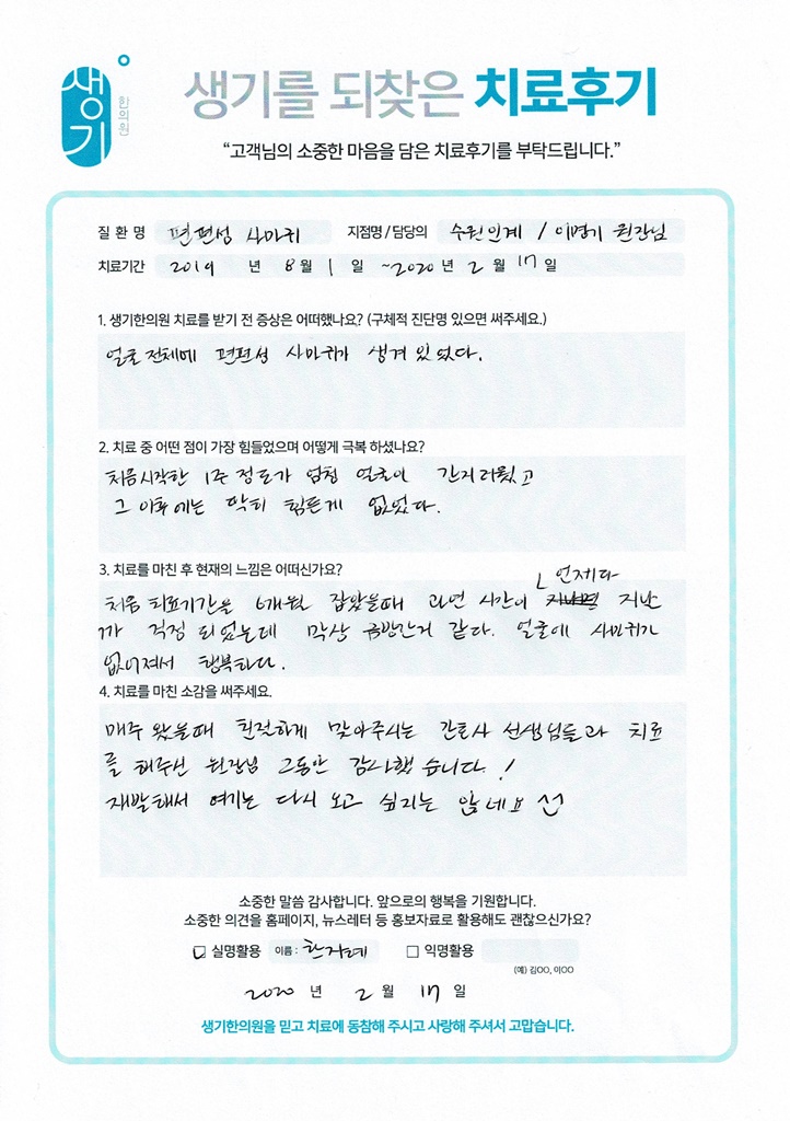 생기한의원과 함께하신 생생한 자필 및 영상 후기를 소개합니다.