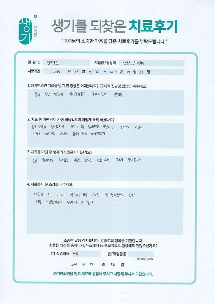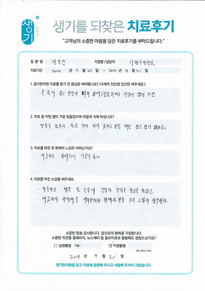생기한의원과 함께하신 생생한 자필 및 영상 후기를 소개합니다.