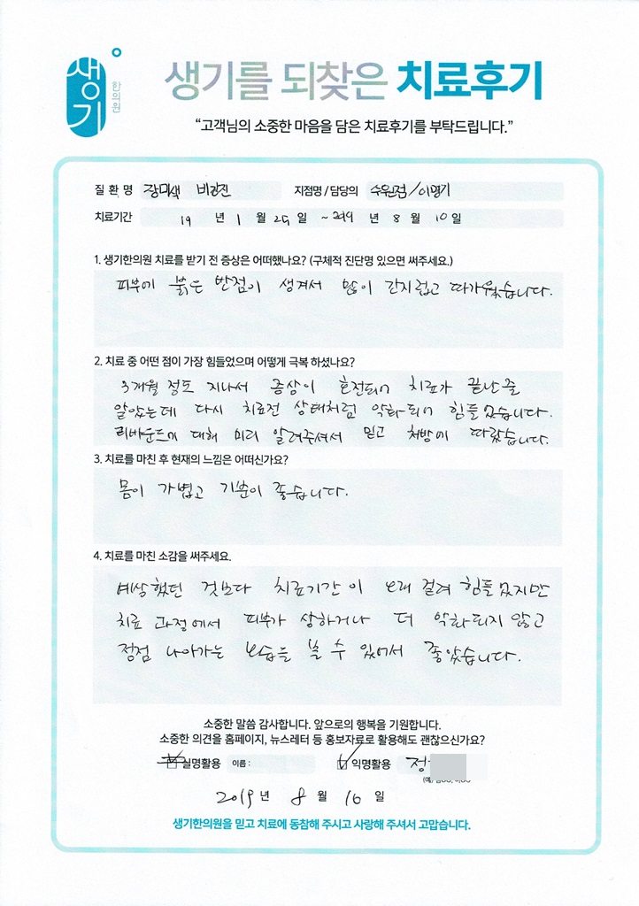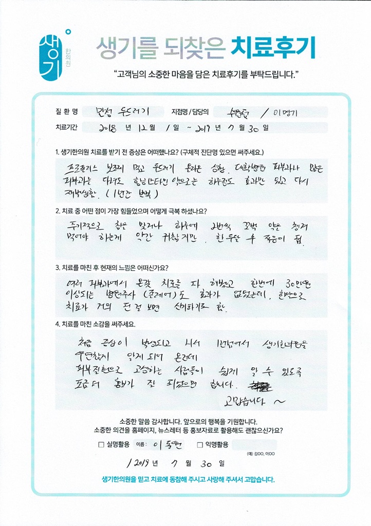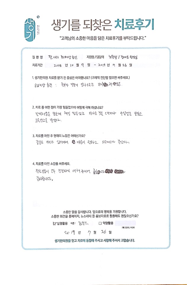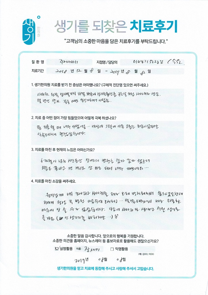 생기한의원과 함께하신 생생한 자필 및 영상 후기를 소개합니다.
