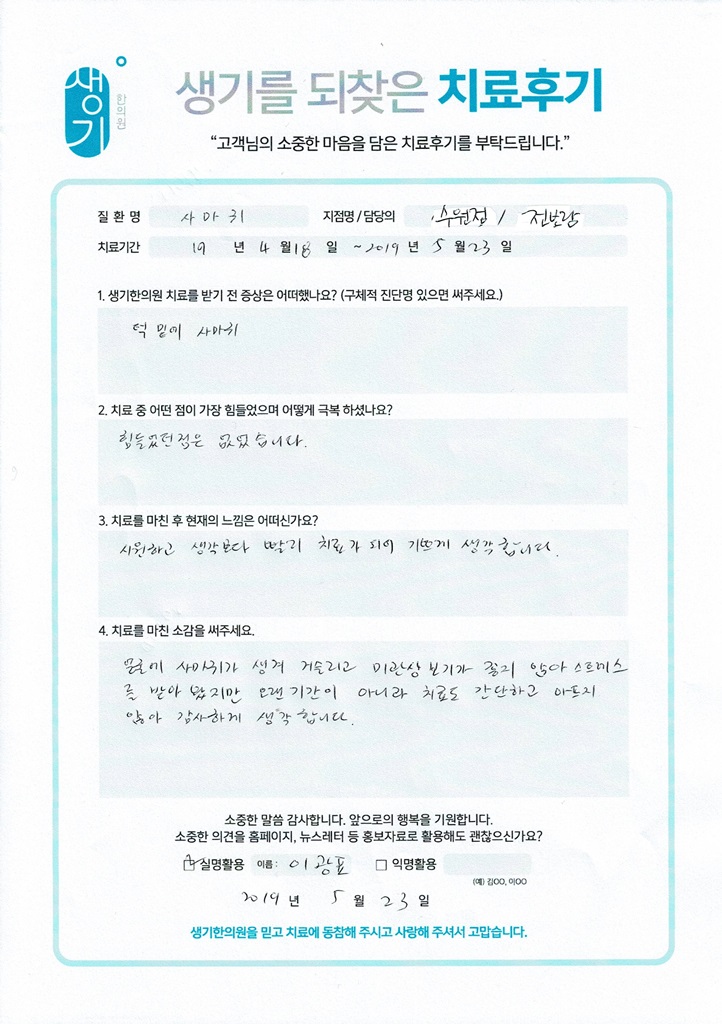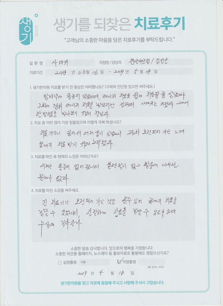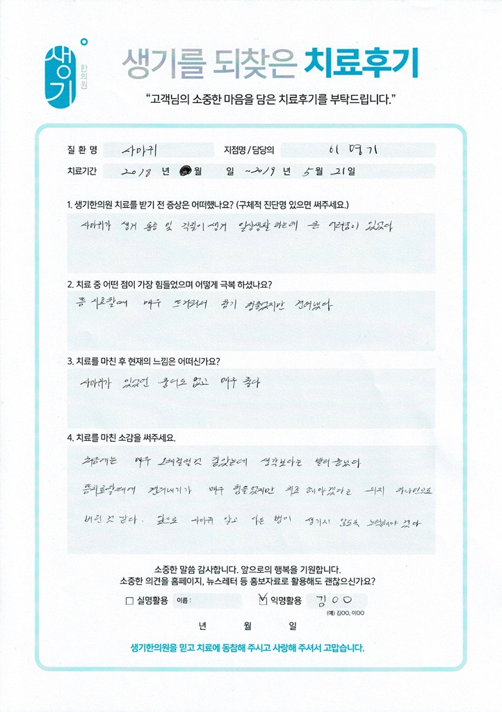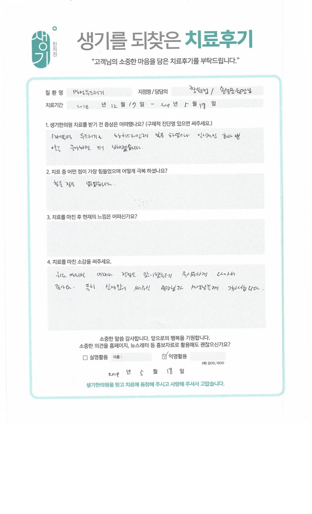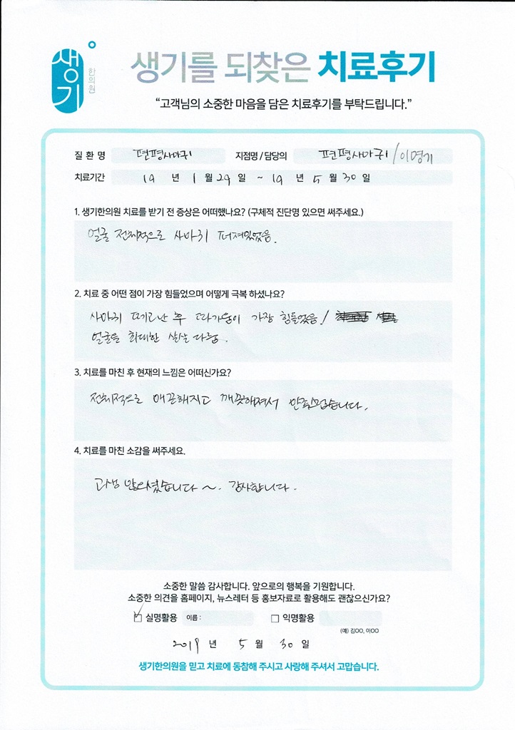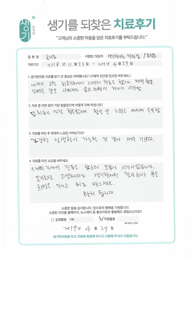생기한의원과 함께하신 생생한 자필 및 영상 후기를 소개합니다.