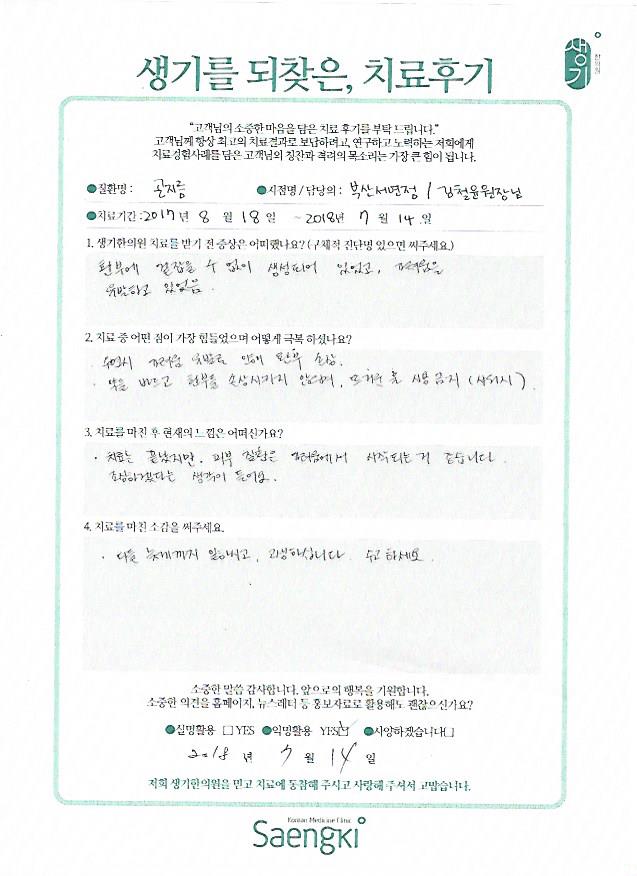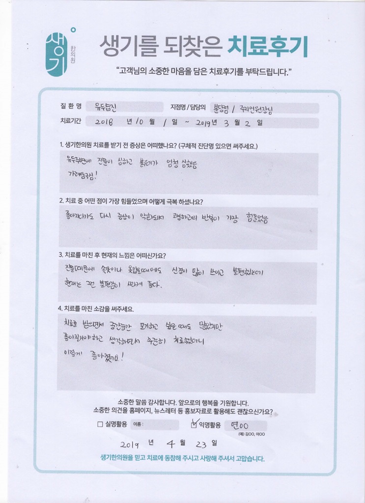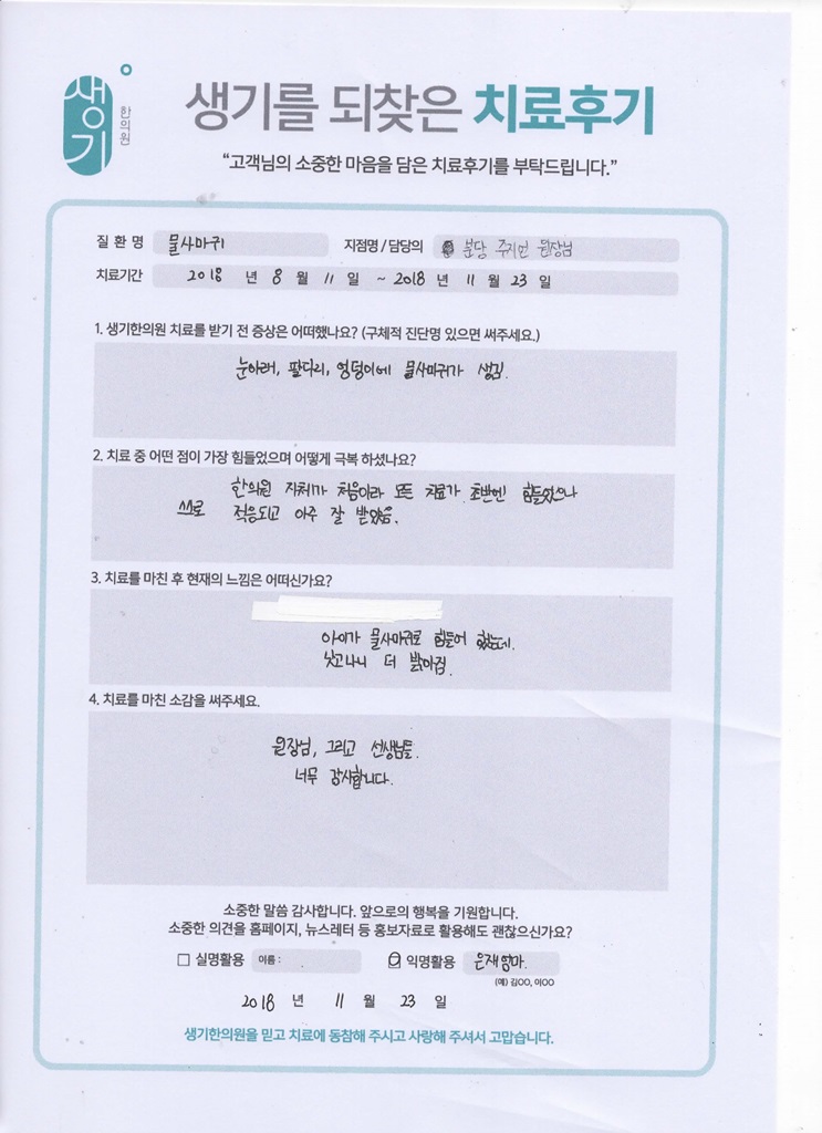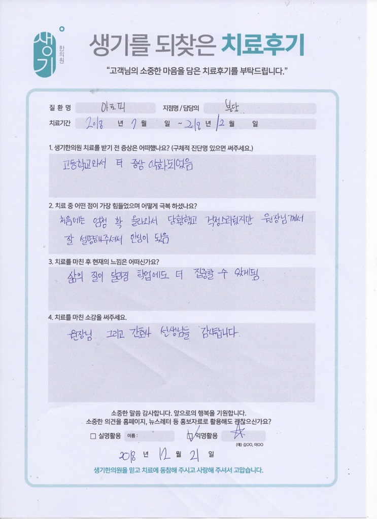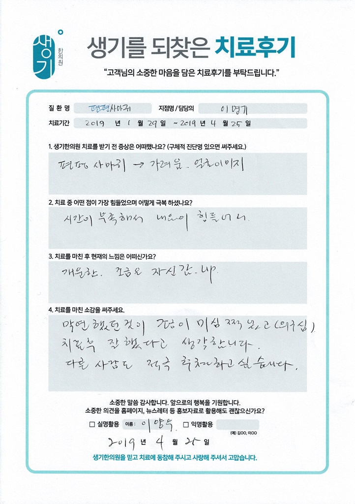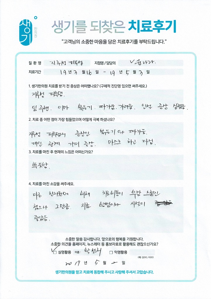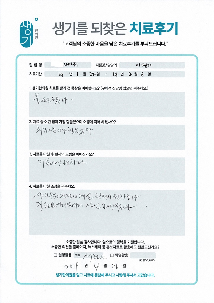 생기한의원과 함께하신 생생한 자필 및 영상 후기를 소개합니다.