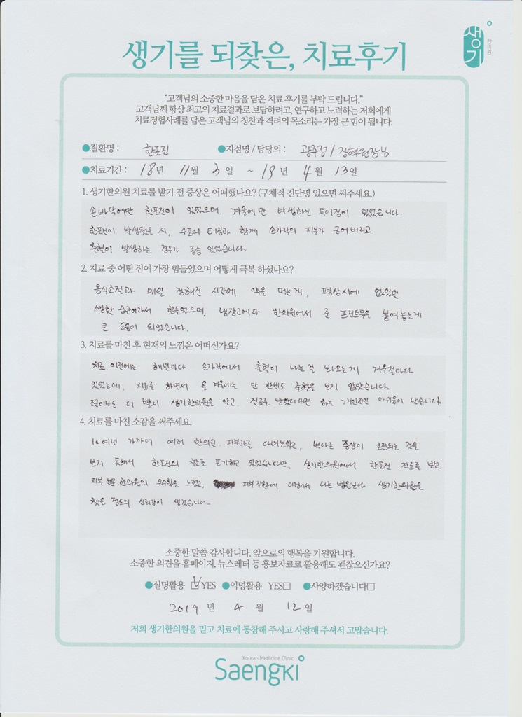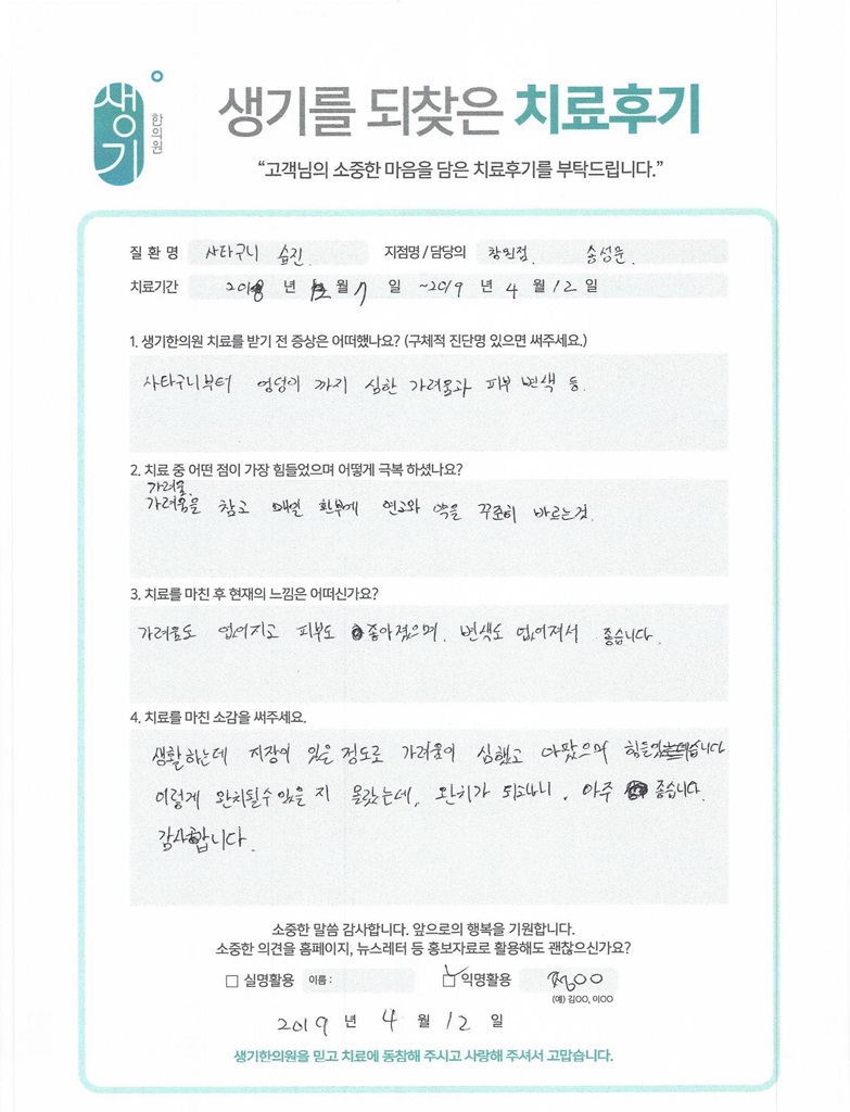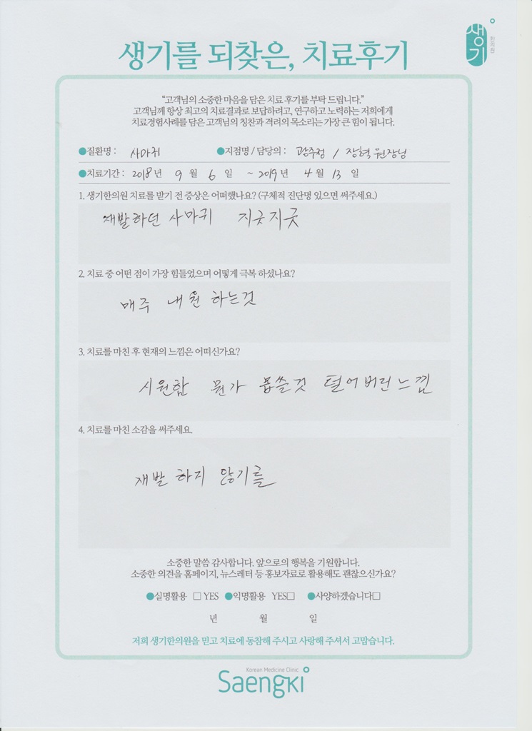 생기한의원과 함께하신 생생한 자필 및 영상 후기를 소개합니다.