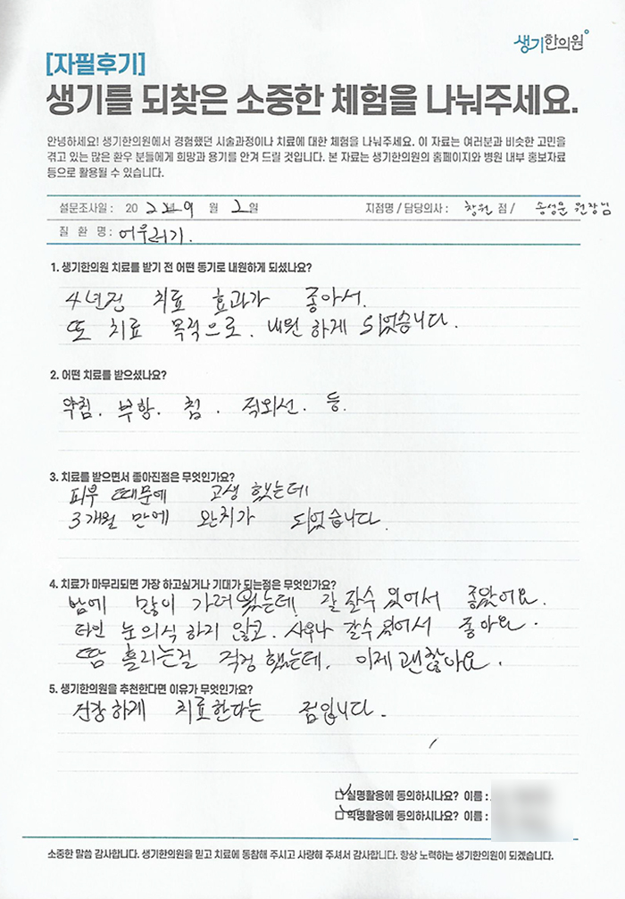생기한의원과 함께하신 생생한 자필 및 영상 후기를 소개합니다.