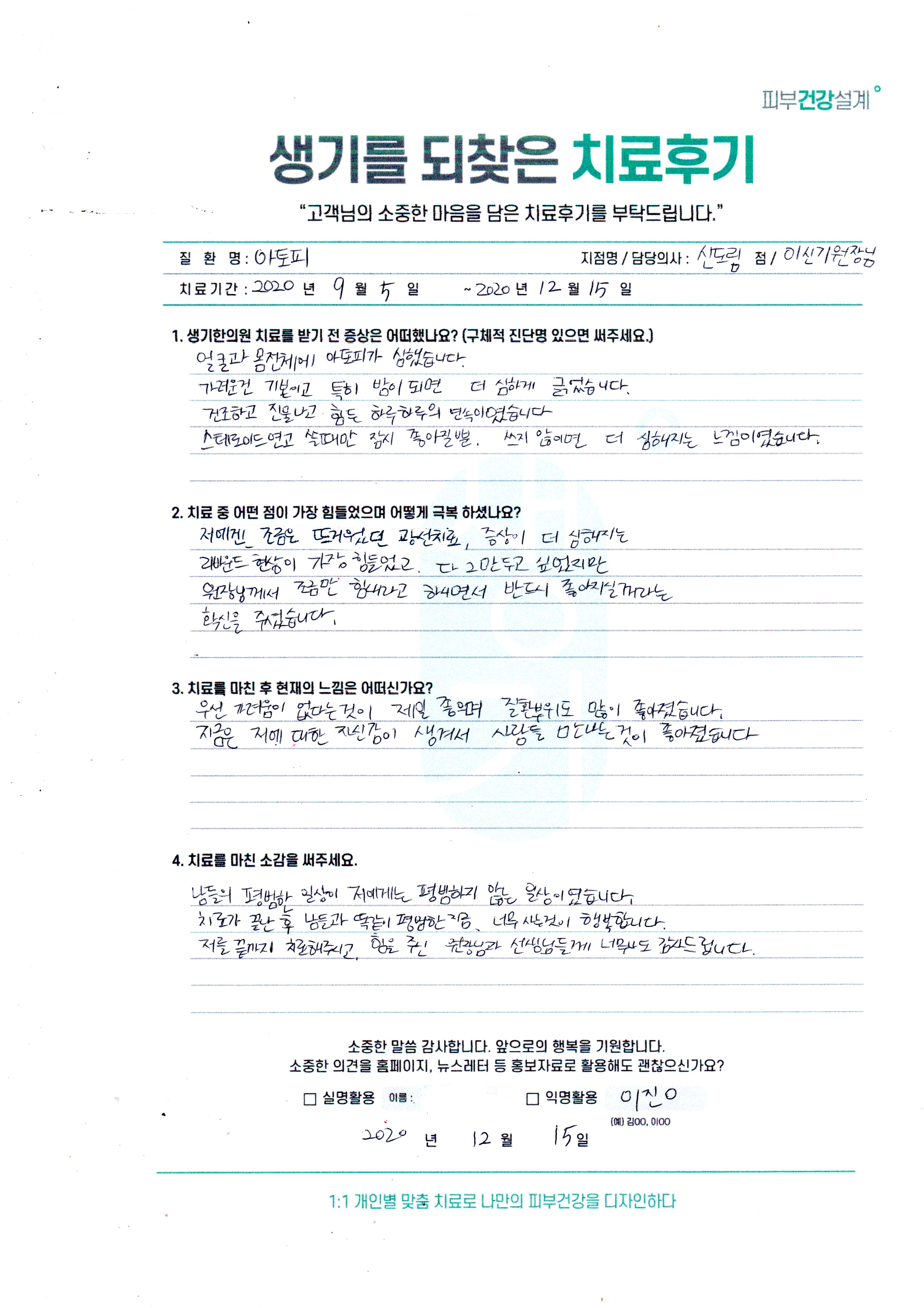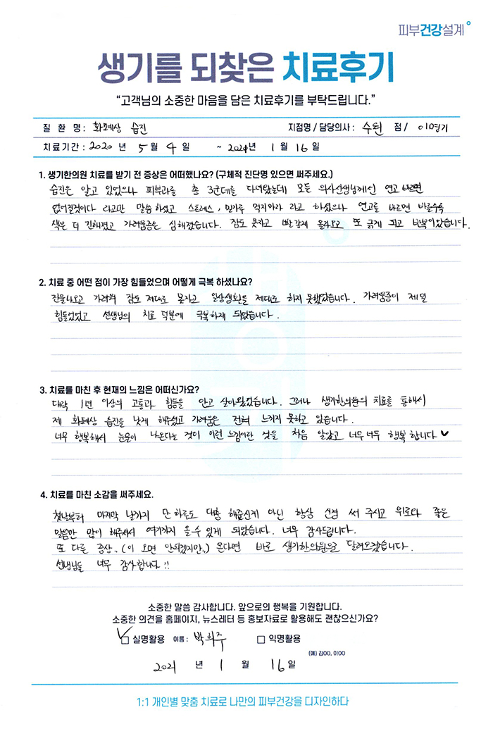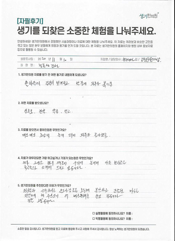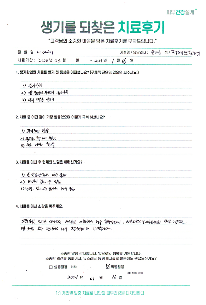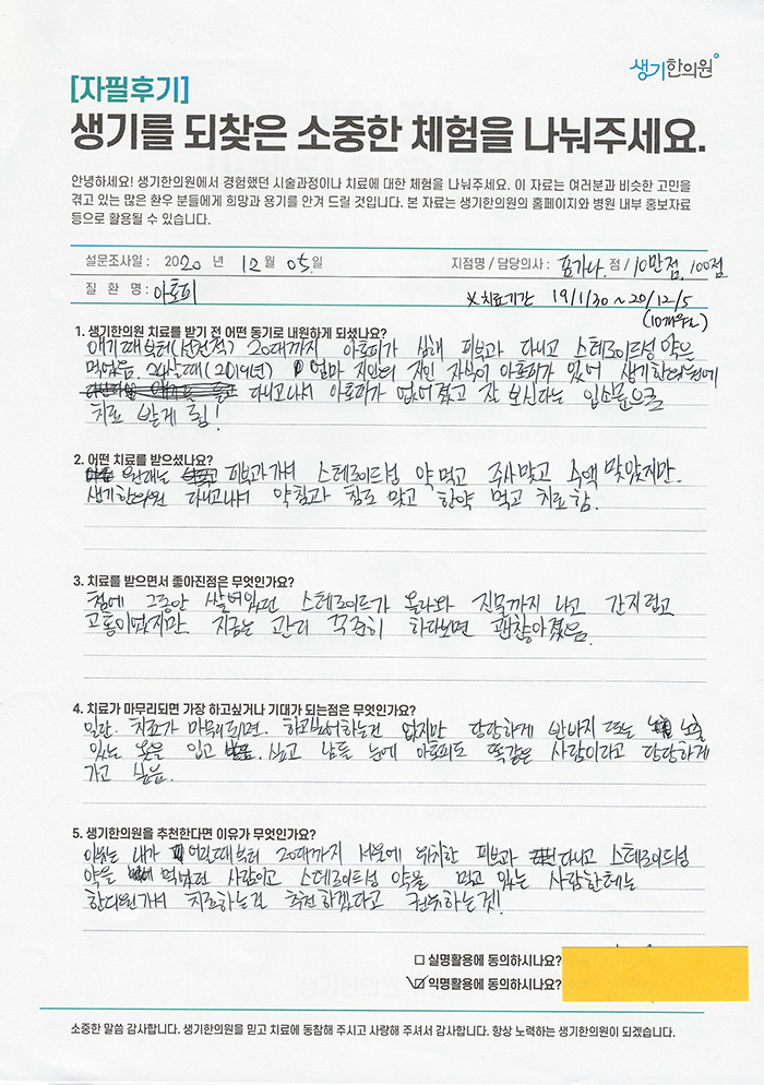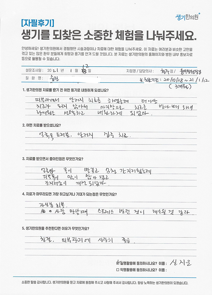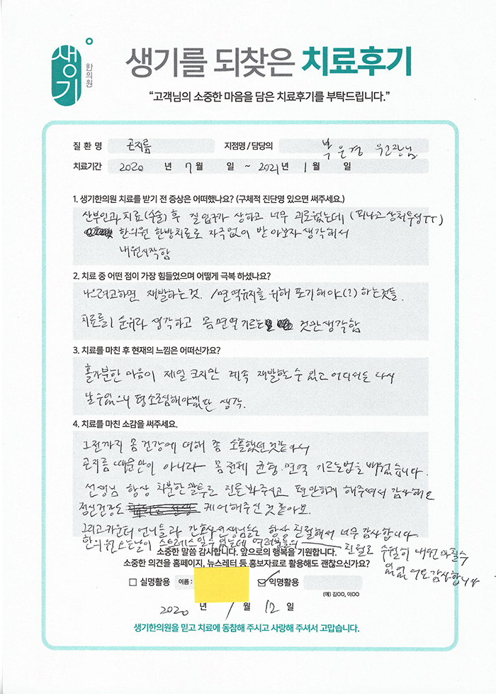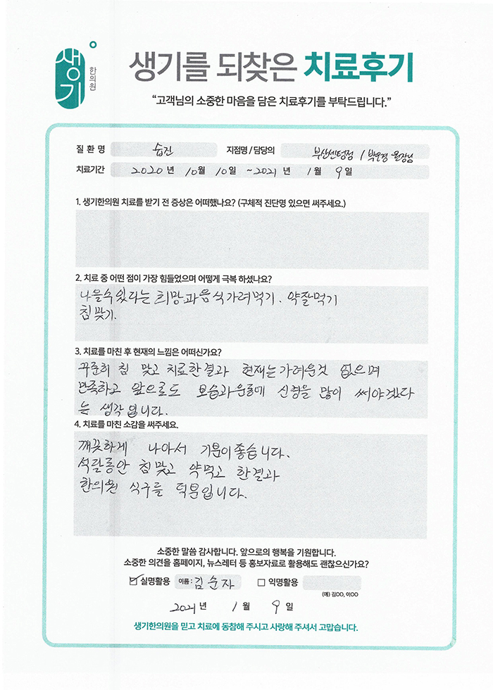 생기한의원과 함께하신 생생한 자필 및 영상 후기를 소개합니다.