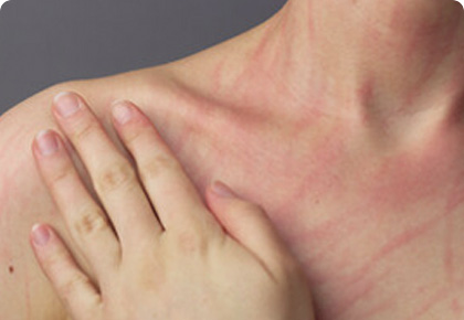 피부에 압력을 주어 긁거나 누르면 가렵고 붉게 부어오르는 “알레르기 질환의 일종”